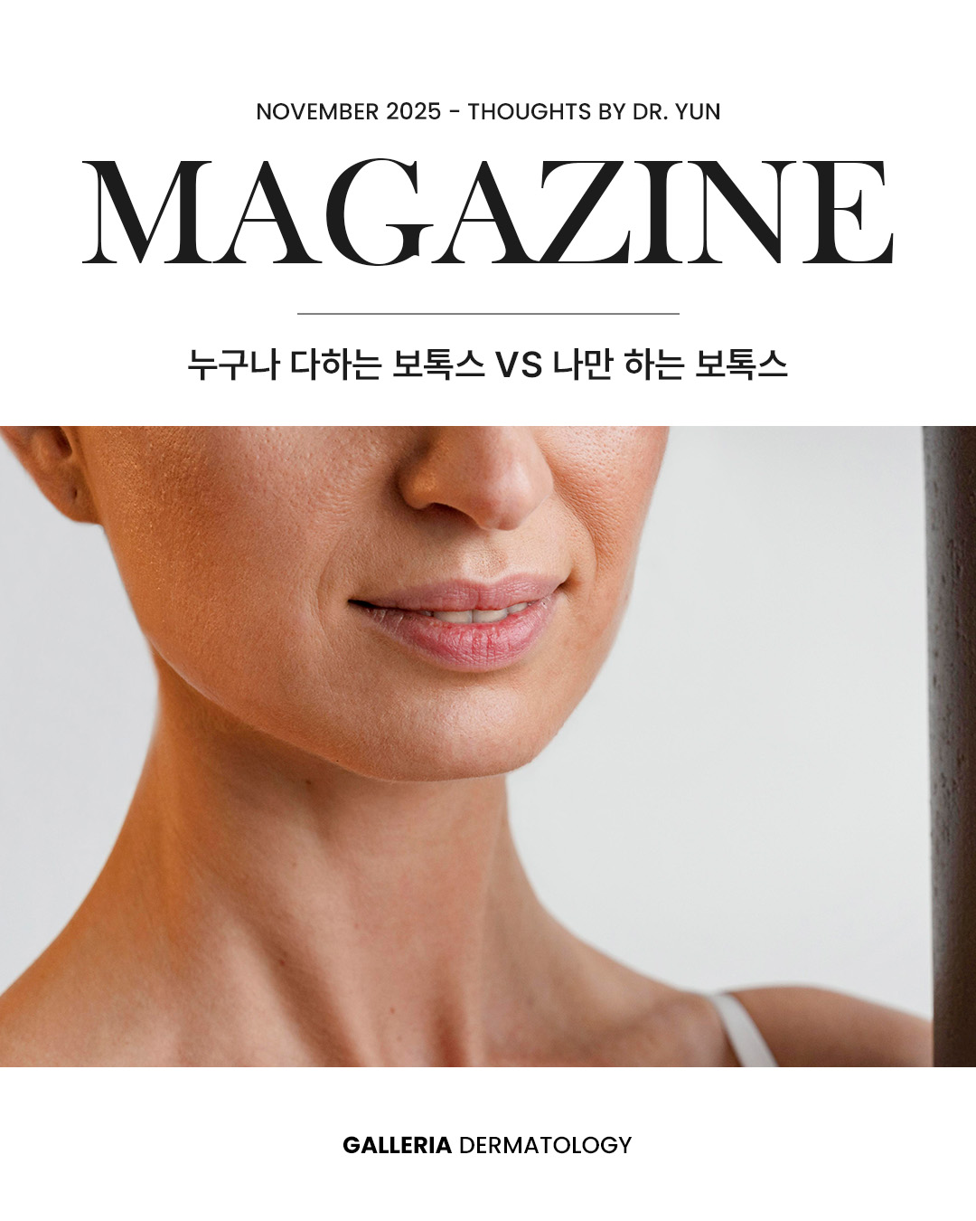 [매거진] 누구나 다하는 보톡스 VS 나만 하는 보톡스요즘은 보톡스가 더 이상 특별한 시술이 아니라, 누구나 자연스럽게 관리하는 기본 루틴이 되었습니다.하지만 미간, 눈가, 이마처럼 익숙한 부위만 정리했다고 해서 얼굴 전체가 자연스럽게 젊어 보이는 것은 아닙니다.팔자주름이 풀리고 턱선이 정돈되더라도, 어딘가 모르게 세월의 흔적이 남아 보이는 이유가 있습니다. 그 흔적은 의외로 입꼬리 처짐, 콧등 가로 주름, 턱 근육 주름과 같은 미세한 노화 패턴에서 시작됩니다.이 부위들은 잘 보이지 않는 만큼 놓치기 쉬워, 전체 밸런스를 무너뜨리거나 시술 티를 만들기도 합니다. 갤러리아는 이러한 미세한 노화 포인트를 중심으로 입꼬리·콧등·턱 근육 주름 보톡스, 그리고 실루엣 소프트 리프팅을 조합해 자연스러운 균형을 맞추는 루틴을 제안합니다.특히 40대를 위한 맞춤 루틴에서는 입꼬리와 호두주름 보톡스를 일 년 세 번 정도,콧등 보톡스와 실루엣 소프트 리프팅을 1~2년에 한 번 병행하여 세월의 흔적을 티 나지 않게 정리합니다. 이 루틴의 핵심은 단순히 주름을 없애는 것이 아니라, 얼굴 전체를 하나의 흐름으로 설계해 본연의 자연스러움을 되찾는 것. 보톡스가 기본이 된 시대, 자연스럽고 섬세한 변화의 기준은 여전히 ‘어디를 어떻게 건드리는가’에서 결정됩니다.갤러리아는 그 기준을 얼굴의 구조와 노화 패턴에서 찾습니다.윤지원 원장님의 기록|2025.11.13 -