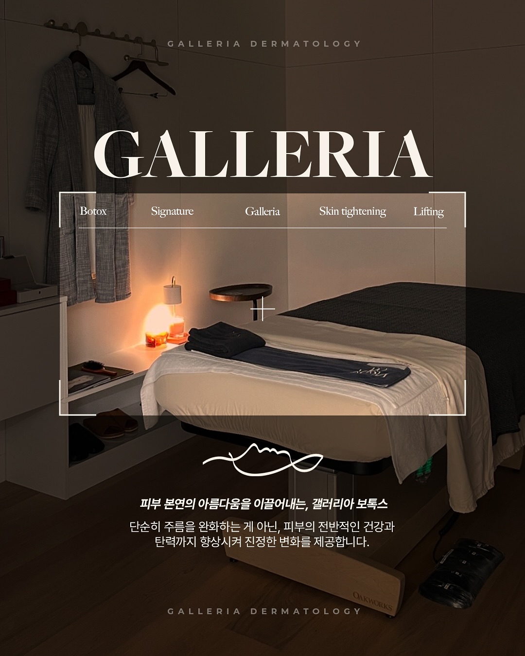 [매거진] 유행을 따르는 시술을 하지마세요40~50대의 얼굴에는 시간이 남긴 나만의 히스토리가 있습니다. 그래서 누군가의 유행이나 광고보다 나의 조직적 특성과 노화의 흐름을 읽을 수 있는 의료진의 안목이 더 중요합니다. 옷에도 디자인에 맞는 원단이 있듯, 피부에도 그에 맞는 시술이 있습니다. 피부 상태와 결, 두께, 탄력에 맞춘 접근만이 자연스럽고 조화로운 결과를 만듭니다. ‘핫한 키워드’는 당신의 아름다움을 대신해 줄 수 없습니다. 갤러리아는 얼굴에 담긴 시간과 경험의 흔적을 존중하며, 그 히스토리를 읽고 가장 이상적인 솔루션을 제안합니다. 단순히 젊음을 좇는 것이 아닌, 당신에게 맞춘 맞춤형 리프팅과 회복의 여정.그 시작은 갤러리아에서 가능합니다.윤지원 원장님의 기록|2024.08.24 -