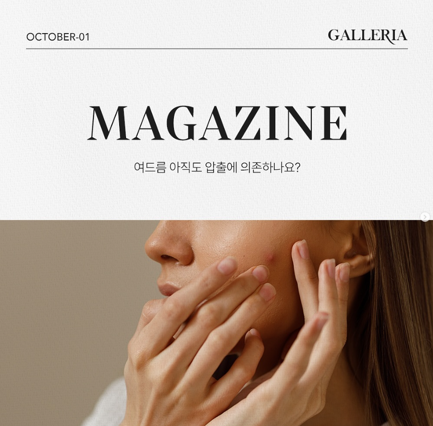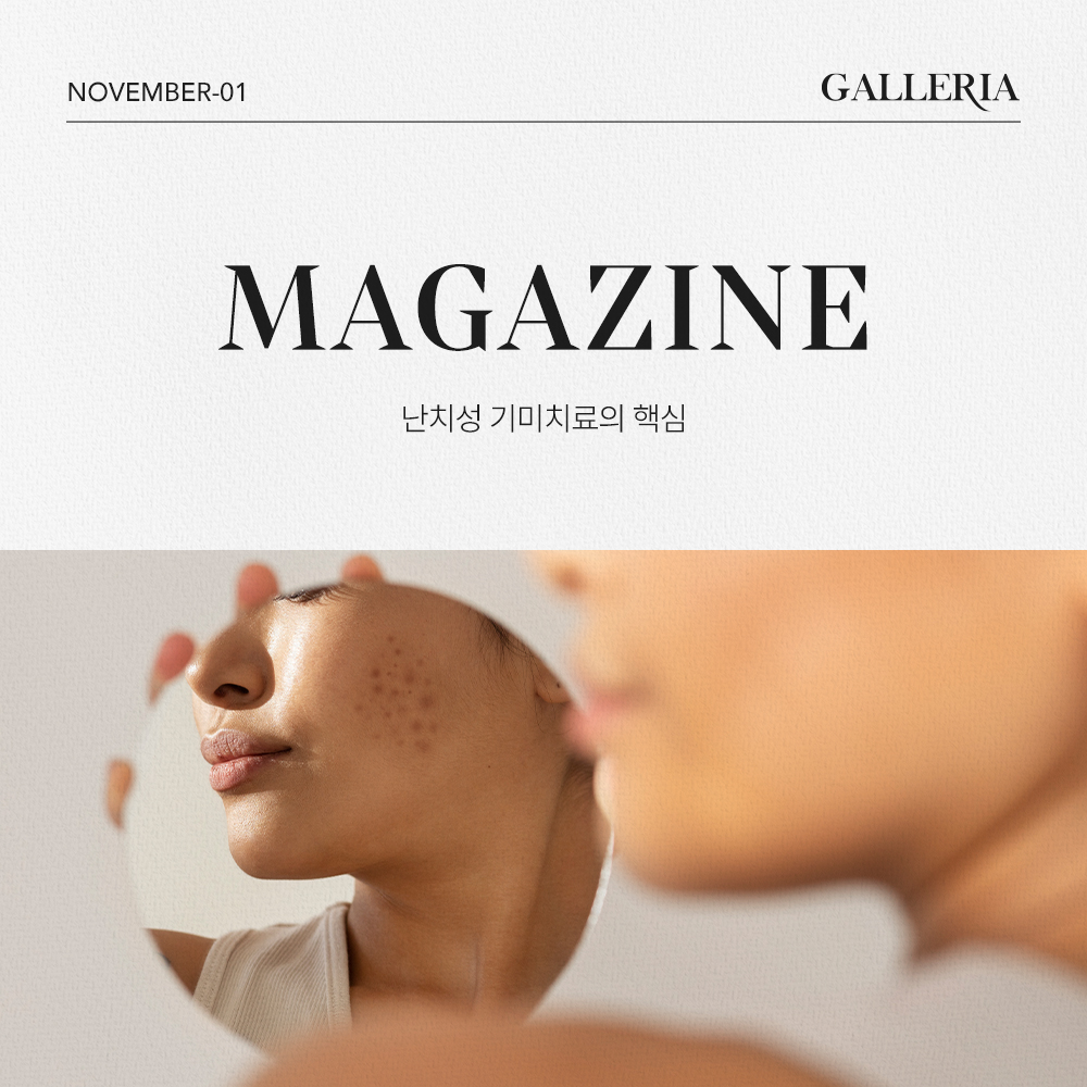 [매거진] 여드름 아직도 압출에 의존하나요?여드름 치료의 목적은 단순히 염증을 가라앉히는 데 그치지 않습니다. 흉터의 악화를 막고, 다시 여드름이 생기지 않는 피부 환경을 만드는 것. 이것이 진짜 치료의 본질입니다. 갤러리아는 단순한 소염 치료를 넘어 피부 재생과 항염 효과를 동시에 갖춘 ASCE 엑소좀과 TUNE IMPACT 시스템을 병합해, 근본적인 피부 환경 개선에 집중합니다. 이 시술은 염증 후 색소침착을 줄이고, 손상된 피부 장벽을 회복시키며, 피지 분비와 트러블의 재발까지 관리합니다. 여드름이 생기는 원인을 ‘없애는’ 것이 아니라, 피부가 스스로 회복할 수 있는 힘을 ‘되찾게 하는 것’.그것이 갤러리아의 여드름 치료 철학입니다.윤지원 원장님의 기록|2024.10.21 -